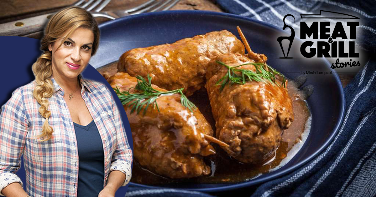 2. Τυλίγετε κάθε φέτα κρέατος, ξεκινώντας από το φαρδύτερο από τα δύο κοντά άκρα,δουλεύοντας έτσι ώστε να κρατηθούν όλα τα υλικά μέσα στο ρολό. Τα ρολά πρέπει να είναι όσο το δυνατόν ομοιόμορφα και σφιχτά. Στερεώνετε τα ρολά (με την πλευρά της ραφής προς τα κάτω) με 3 θηλιές από σπάγκο κρεοπώλη, μία στη μέση και μία σε κάθε άκρο.